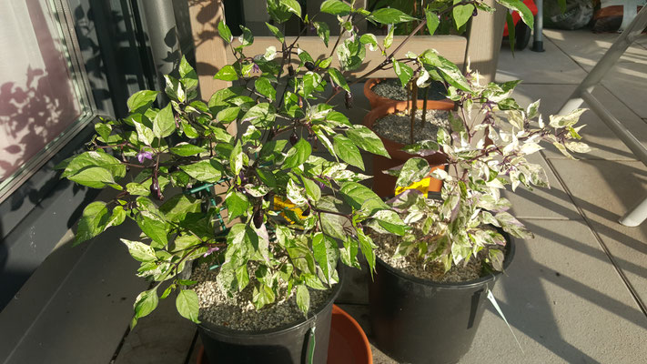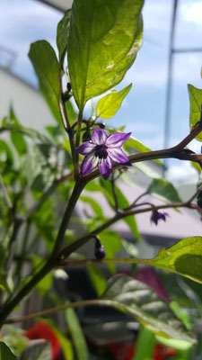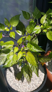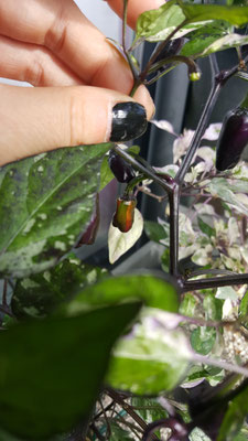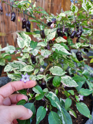 Diese Annuum Sorte ist für mich optisch eine der schönsten Chili. Ihre Blätter sind panaschiert, was bedeutet sie verfärben sich weiß und lila. Dies ist natürlich etwas ungünstig für die Pflanze selbst da sie das Chlorophyll benötigt um Sonnenlicht zu absorbieren, aber trotzdem ein echter Hingucker. Auch ihre Blüten sind atemberaubend. Ihre Schärfe ist im mittleren Bereich von 6 mit 5.000 - 15.000 SHU ohne besonderes Aroma. Ihre Größe mit 60 cm macht sie ideal für die Haushaltung. Auch ihre Früchte reifen innerhalb von 75 Tagen spektakulär ab. Beginnend mit einem Violett zu Grün Orange gestreift bis Feuerrot. Die Herkunft ist unbekannt.