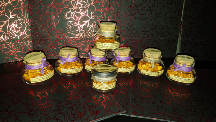Da ich einige Pflanzen hatte, habe ich viele getrocknet und zu Flocken verarbeitet. Außerdem habe ich es mit verschiedenen Salzen gemischt. Roter Spanischer Pfeffer mit dem edlen Sel Gris Meersalz aus der Bretange in Frankreich. Gelber Spanischer Pfeffer mit dem intensiven Meersalzkristallen aus Ibiza. Orangefarbene Spanischer Pfeffer mit den milden Meersalzflocken aus Fuerteventura.