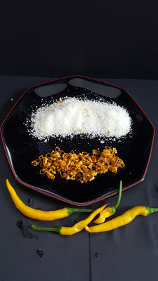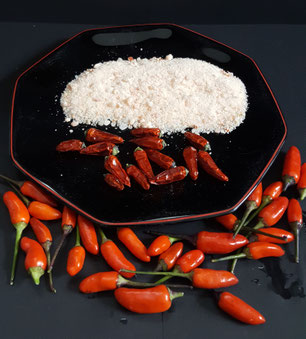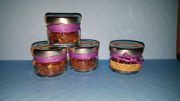 Ich habe diese Chili getrocknet und zu Flocken verarbeitet, ebenso habe ich sie mit einem intensiv salzigen aber dennoch zartschmelzenden Fleur de Sel (Meersalzflocken) aus Afrika gemischt.