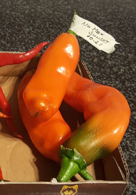 Diese Annuum Sorte kommt aus Italien und das kann man irgendwie schmecken. Eine moderate Schärfe von 7 mit 15.000 - 30.000 SHU. Die Früchte reifen innerhalb 80 Tage von Grün über Gelb/ Orange zu Rot. Die Pflanze selbst wir nur 50 cm groß.