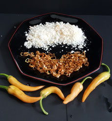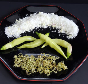 Eine wirkliche schöne und geschmacklich überraschende Chili. Ich habe sie getrocknet und in feine Ringe geschnitten. Außerdem habe ich sie mit zartschmelzenden Meersalzflocken aus Reykjane in Island gemischt.