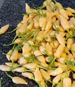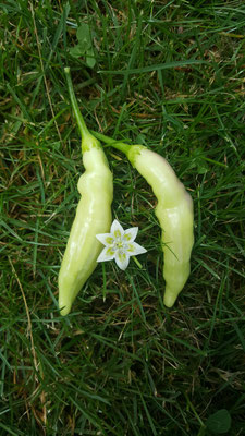 Diese Chili ist eine wirkliche Besonderheit. Ihre Früchte bilden sich in Weiß und reifen dann in ein zartes Creme ab. Der Unterschied ist kaum sichtbar, daher sollte man die Reifezeit im Auge behalten. Sie reift innerhalb 90 - 100 Tage, im Zweifel also hängen lassen und warten. Die Pflanze selbst wird 80 cm, hat einen buschigen Wuchs und trägt Massig an Schoten.