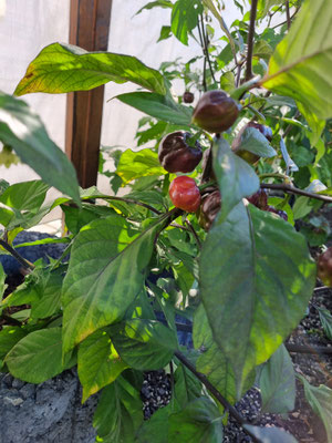 Leider hatten alle Pflanzen einen enormen Sonnenbrand auf den Blättern, sodass die Pflanze erst einmal neue Blätter produzieren musste. Mit dieser langen Reifezeit hat es leider nicht mehr zum fertigen abreifen gereicht.