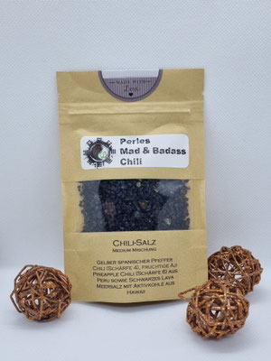 Viele Früchte konnte ich nicht ernten, da die Pflanzen einen starken Sonnenbrand hatten und erst einmal Zeit brauchten zum neu bilden der Blätter. Das hat die Pflanzen im Zeitplan etwas zurückgeworfen und irgendwas hat sich in die Chilis gefressen. Die wenigen die geerntet werden konnten habe ich mit dem Palm Island White Silver Meersalz aus Hawaii gemischt.